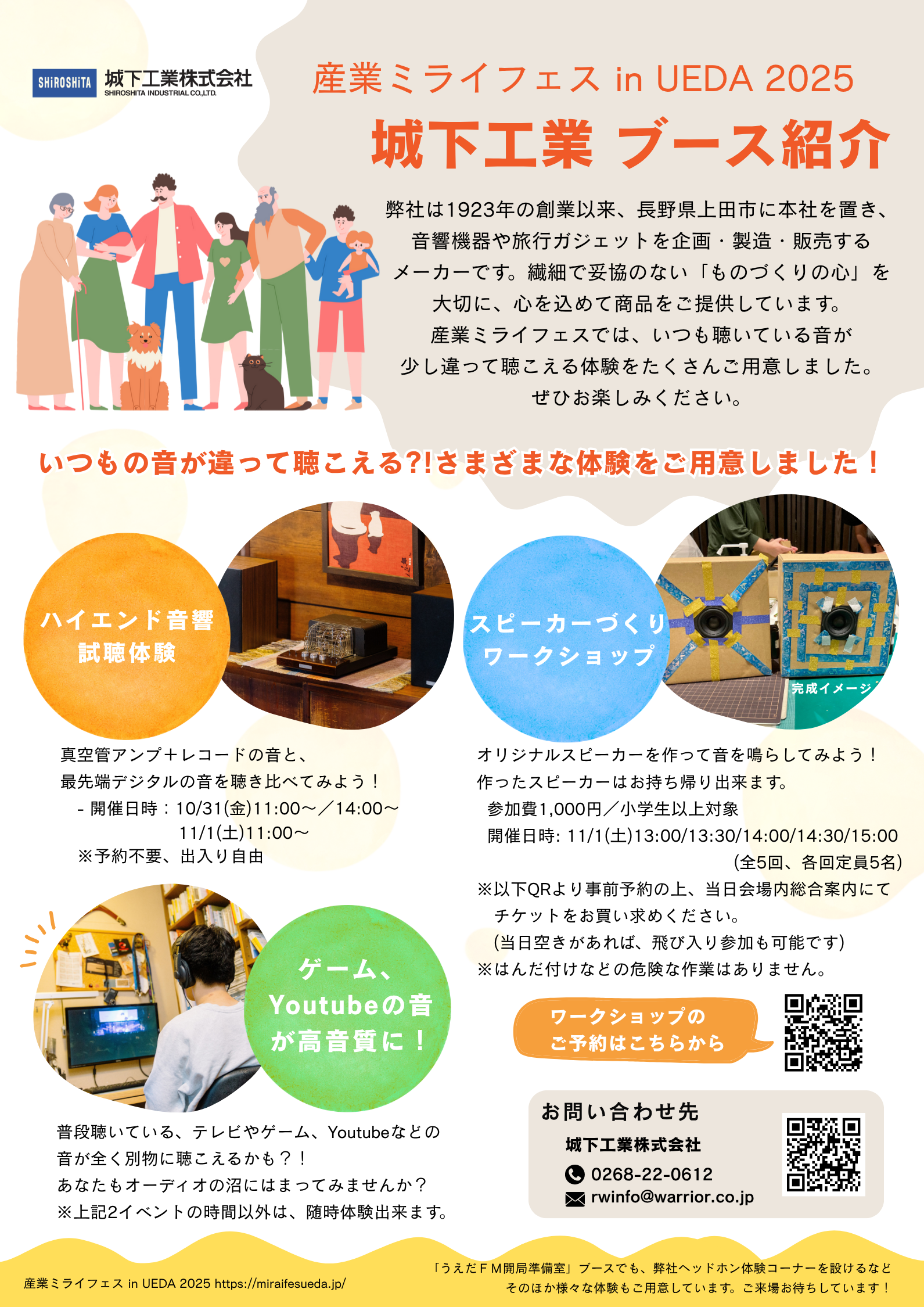 弊社はサントミューゼ内スタジオ1にて、ハイエンドオーディオ試聴体験や、弊社製品を使ったゲーム・Youtube・テレビの高音質化、子ども向けスピーカーづくりワークショップなど、いつもの音が少し違って聞こえるような体験を多くご用意しています。また、お隣の「うえだFM開局準備室」でも弊社ヘッドホン体験コーナーを設けるなどのコラボレーションも実施いたします。